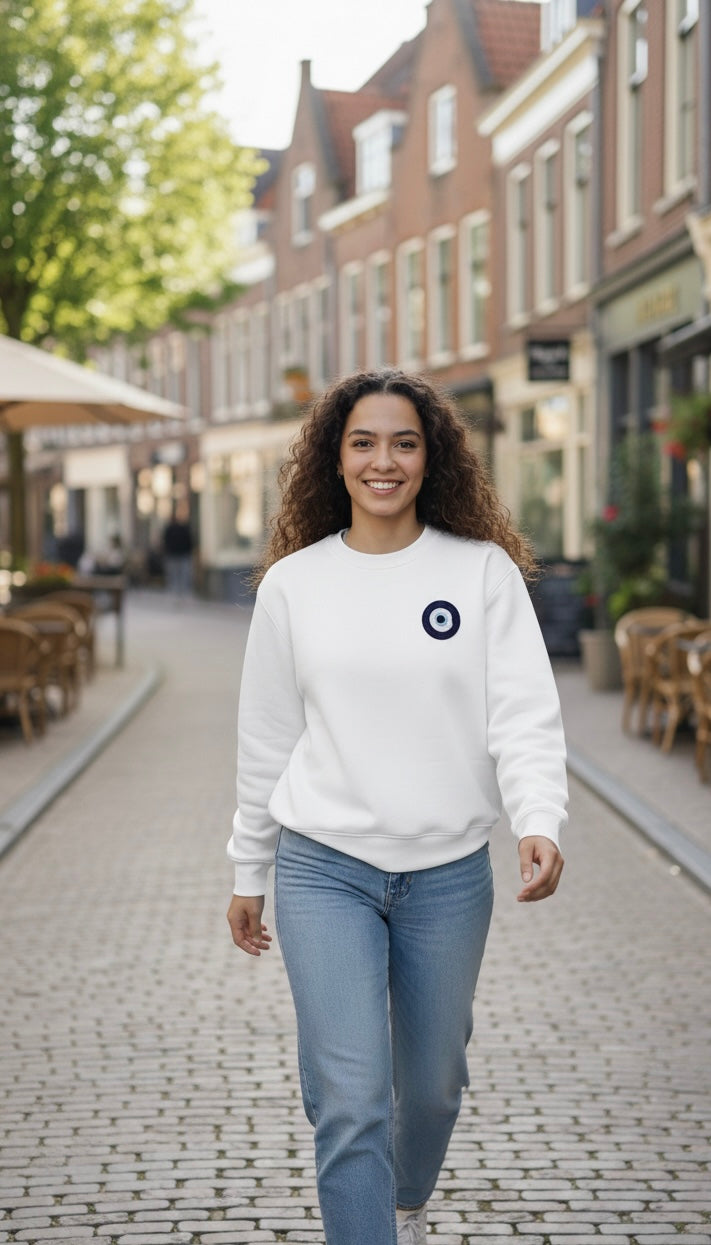 Παράδοση και μοντέρνα αισθητική σε ένα μοναδικό κομμάτι. Το κλασικό σύμβολο προστασίας αποκτά μια σύγχρονη, καλλιτεχνική μορφή. Αυτό το λευκό φούτερ της Tharw φέρει το Μάτι, το οποίο δημιουργείται με την τεχνική cord art, ραμμένο προσεκτικά στη ραπτομηχανή. Η ανάγλυφη υφή του κορδονιού προσδίδει βάθος και μοναδικότητα που δεν συναντάται σε καμία βιομηχανική εκτύπωση.