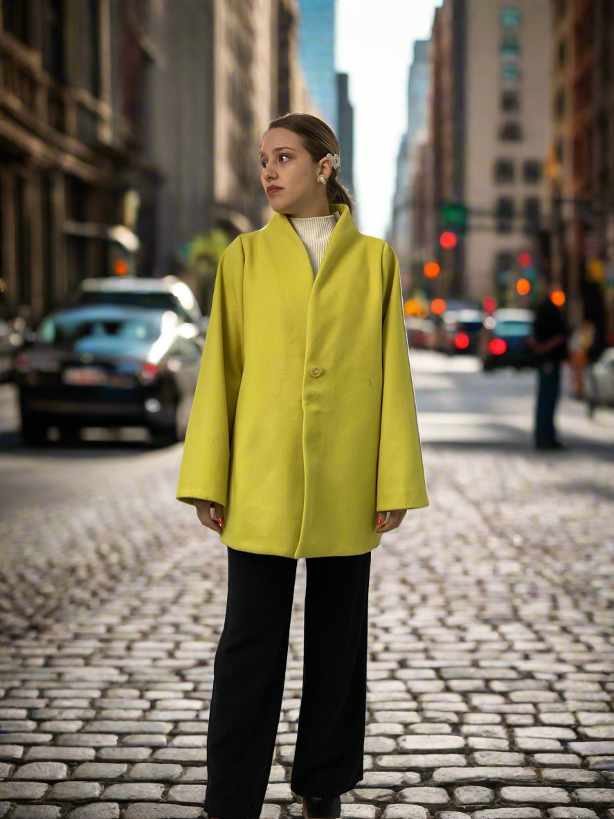 Το Lime Παλτό είναι ο τέλειος σύμμαχος για να ξεχωρίσετε. Συνδυάστε το με ένα μάλλινο πουλόβερ και δερμάτινα παντελόνια για ένα chic φθινοπωρινό look ή φορέστε το πάνω από ένα φόρεμα με μποτάκια για μια πιο θηλυκή εμφάνιση. Το ζωηρό κίτρινο χρώμα προσθέτει μια δόση τόλμης, ενώ η χαλαρή εφαρμογή εξασφαλίζει άνεση και στυλ από το πρωί μέχρι το βράδυ. Είναι το ιδανικό παλτό για να αναδείξετε τη μοναδικότητά σας σε κάθε έξοδο.