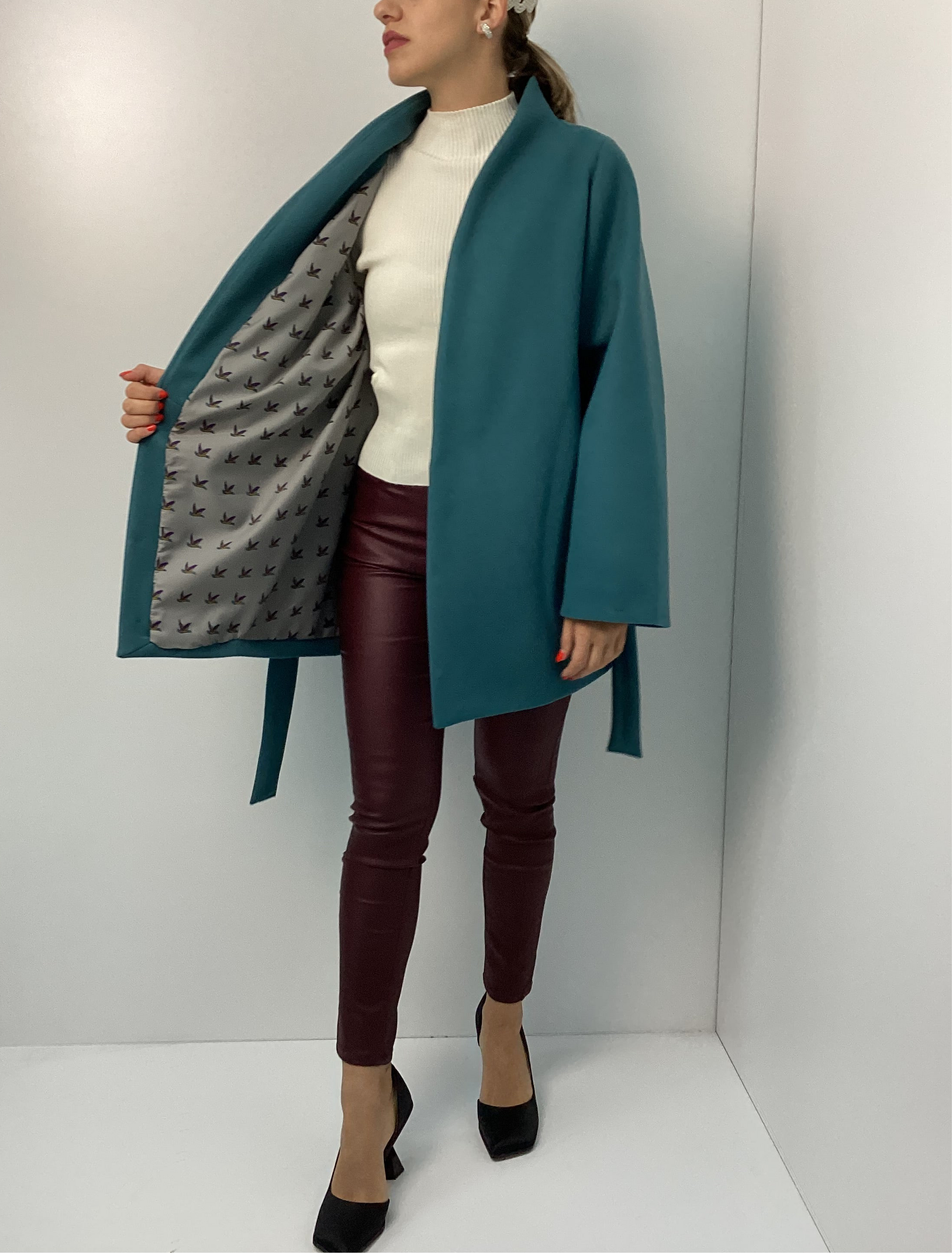 Ανακαλύψτε την κομψότητα και την άνεση με το Πετρολ Παλτό Χειροποίητο One Size, ένα μοναδικό κομμάτι από τη συλλογή Tharw 2025. Φτιαγμένο στην Ελλάδα από 100% πολυεστέρα, αυτό το παλτό συνδυάζει πολυτέλεια και πρακτικότητα, προσφέροντας μια εκλεπτυσμένη επιλογή για τις φθινοπωρινές και χειμωνιάτικες σας εμφανίσεις. Η εσωτερική φόδρα με μοτίβο πουλάκια εξασφαλίζει επιπλέον άνεση, ενώ η ζώνη στη μέση κολακεύει τη σιλουέτα, δημιουργώντας μια θηλυκή και σύγχρονη γραμμή.
