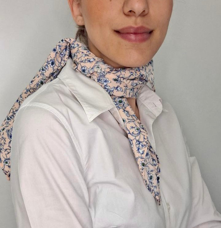 Απαλό, αέρινο και με ρομαντική αύρα, το φουλάρι Vintage Bloom είναι εμπνευσμένο από τη διαχρονική κομψότητα της φύσης. Με φόντο σε απαλό ροδακινί τόνο και λεπτομέρειες σε μπλε και πράσινες αποχρώσεις, αυτό το floral σχέδιο αποπνέει μια αίσθηση νοσταλγίας και φινέτσας.